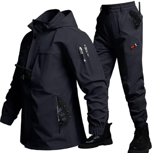 アウトドアジャケット上下セット。撥水・防風機能付きのマウンテンパーカーとトレッキングパンツ。フードは取り外し可能で、多ポケット設計。春秋に最適な作業着や釣り、バイクにもおすすめ。サイズ: 3XL、カラー: 黒柄。