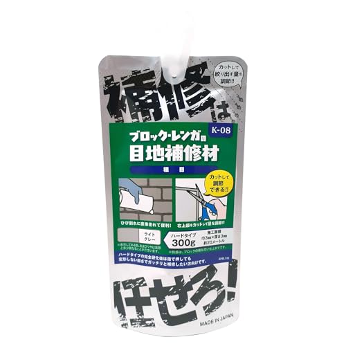 家庭化学の目地補修材、ブロック・レンガ用のハードタイプです。容量は300g、色はライトグレーの粗目パテです。日本製で、修補作業に最適な製品です。
