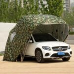 Bynarカーポートは、折りたたみ式のガレージテントで、南京錠付き。UVカット、防水、防風性能を備え、簡易車庫として車を保護。サイズは600 x 270 x 250 cmで、迷彩デザインが特徴です。