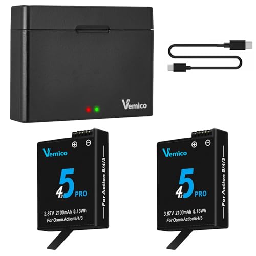 VemicoのDJI Osmo Action 6用バッテリーはPSE認証済みで、2つの2100mAhバッテリーと充電器がセット。Type-Cポートで同時充電可能。Action 6/5 Pro/4/3に対応。
