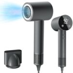 大風量の速乾ヘアドライヤー。3億高濃度マイナスイオン、ブラシレスDCモーター搭載。12通りの風カスタマイズ、NTC温度制御、軽量コンパクト。静電気除去、PSE認証、旅行用にも最適。