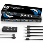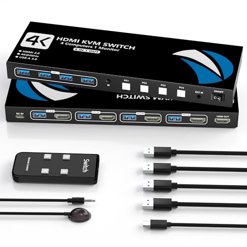 KVMスイッチ HDMI 4台用、4入力1出力、リモコン付き。4つのUSB 3.0ポート、5Gbps転送速度。4K@60Hz出力対応。USBデバイス、キーボード、マウス切り替え可能。4本のUSB3.0ケーブル付属。