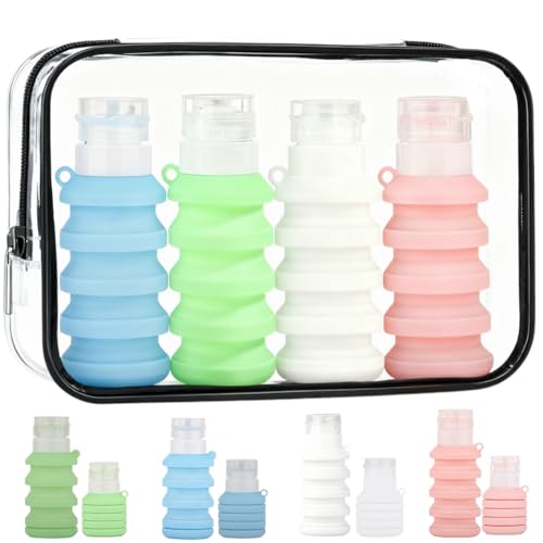旅行用ボトル4点セットは、シリコン製で折りたたみ式の便利な収納容器です。化粧品などを入れて、アウトドアや出張に最適。男女兼用で収納バッグ付き。使いやすさ抜群です。