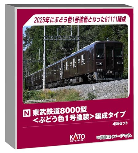 カトーのNゲージ 東武鉄道8000型ぶどう色1号塗装の4両セットです。精密なディテールとリアルな塗装で、鉄道模型ファンに最適なアイテム。品番は10-980です。
