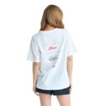 ロキシーの半袖ラッシュガードTシャツ。水陸両用でUVカット機能付き。アウトドアやマリンスポーツに最適。品番RLY261037、レディース用。サイズJP M MUL。