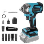 電動インパクトレンチは750N・mの強力ブラシレスモーター搭載。無段変速、正逆両用、4速切り替え、自動停止モード。LEDライト付きで小型、人間工学デザイン。18Vバッテリー、マキタ互換、ソケット6本付き。