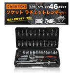 46種のソケットレンチセット。ラチェットレンチ、ソケットドライバー付きで、自動車やバイク、自転車の整備に最適。差込角は6.3mm(1/4インチ)。ケース付きで持ち運びに便利なブラックデザイン。