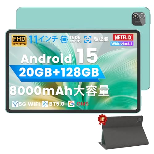 Azeyou 11インチ Android15 タブレットは、1920*1200解像度、8コアCPU、18GB RAM、128GBストレージ(1TB拡張可能)。8000mAhバッテリー搭載、5G Wi-Fi、顔認識、Widevine L1対応。
