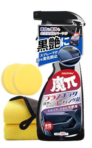 Zepan Car 車用プラスチックコーティング剤は、未塗装樹脂やゴムパーツに対応。耐久性が高く、ツヤを復活させ、劣化を防ぎます。研磨不要で内装外装に使え、500mlの容量です。