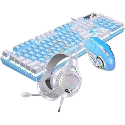 USB接続の光るゲーミングキーボードとマウスセット。K500メカニカルキー採用で騒音低減、快適な使用感。マウスパッドとヘッドフォン付き、青と白のスタイリッシュなデザイン。