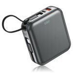 PandaBox小型モバイルバッテリー10000mAh。タイプC/ライトニングプラグ一体型、2本ケーブル内蔵で22.5W急速充電対応。軽量コンパクトで持ち運び便利。iPhoneやAndroidデバイスに対応。PSE認証済み。