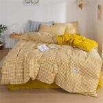 NICE FIVEの布団カバーセット(シングル、4点セット)の詳細。掛け布団カバー、ベッドシーツ、ボックスシーツ、枕カバーが含まれています。洗濯可能で速乾性、肌に優しく、シンプルなカラーマッチング。チェック柄のイエローが特徴です。