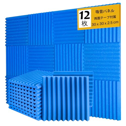 Saiqiangの防音シートは、12枚の青いウレタンフォーム製吸音パネルから成り、サイズは30*30*2.5cm。難燃性で、室内の騒音対策に最適。両面テープ付きで取り付けも簡単。