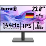 TERRA 2441Wは23.8インチのフルHD IPSモニターで、144Hzリフレッシュレートを持ち、HDMI/VGA対応。最長5年保証、非光沢パネル、ブルーライトカット機能、スピーカー、ヘッドホン端子、傾き調整も可能。