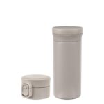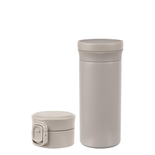 シームレスステンレスボトル350ml。パッキン一体型でワンタッチ栓、スクリュー栓、ハンドル付き。直飲み可能で真空断熱、食洗機対応。保温・保冷機能あり。カラーはグレー。