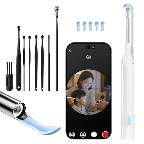 カメラ付き耳かき。AI温度制御、超高画素6LEDライト搭載。極細レンズで耳掃除、録画・写真機能、左右反転。IP67防水、WIFI接続、Type-C充電。9点セットで子供から大人まで対応。日本語説明書付き。