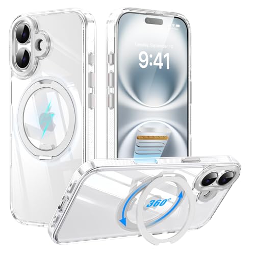 Tekka iPhone 16 用 ケース【360°回転スタンド一体型・MagSafe対応】 リングスタンド付き マグネット吸着 急速充電対応 米軍MIL規格 耐衝撃 薄型 軽量 クリア 指紋防止 黄変防止 カメラ保護 動画視聴 撮影にも便利 (クリア, iphone_16) 高価買取中
