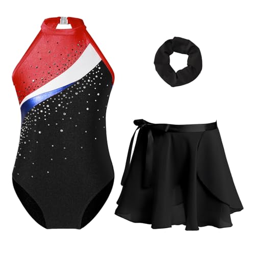 RUNQHUIの子供用女の子向けコスチュームは、フィギュアスケートやダンス、体操パフォーマンスに最適です。光沢のある赤色レオタードには、ラインストーンとスカートが付いており、ヘアバンドもセットになっています。14歳向け。
