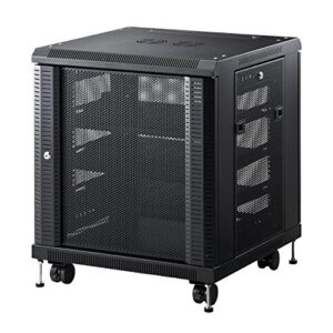 サーバーラックのオープンフレーム型ネットワークラック。ケーブルマネジメント機能、モバイル用4輪キャスター、9U~24Uのサイズ、48cmの高さ調整が可能。高耐久性設計、D33.3cm(13 1/8″)。