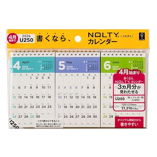 能率 NOLTY カレンダー 2026年4月始まり卓上A5変型。3ヶ月分の見開きデザインで、スケジュール管理に便利です。シンプルで使いやすく、デスクに最適なサイズです。