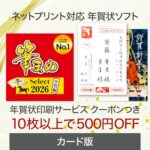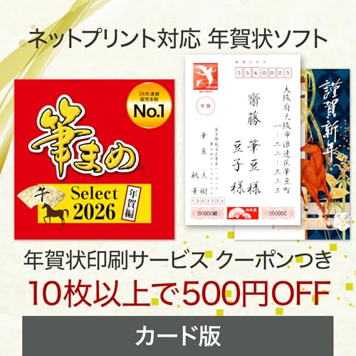 ソースネクストの筆まめSelect2026年賀編は、Windows対応のはがき作成ソフトです。10枚以上のご利用で使える500円引きクーポン付き。