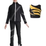 Miutii製の子供用フィギュアスケートトレーニングコスチューム。長袖ジャケット、短いトップ、ベスト、レギンス、パンツのセット。ゴールド&ブラック色でスタイリッシュ。14歳向けアクティブウェア。