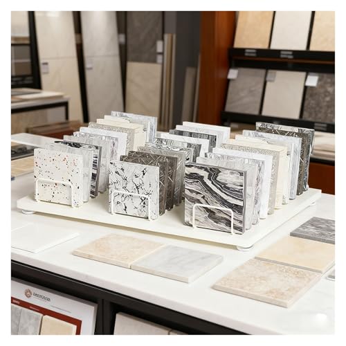 小型卓上タイルディスプレイラック。ショールームや小売店向けに最適なマルチスロットのサンプルスタンド。省スペース設計、ホワイトカラー、サイズL-34CM(13.4IN)。