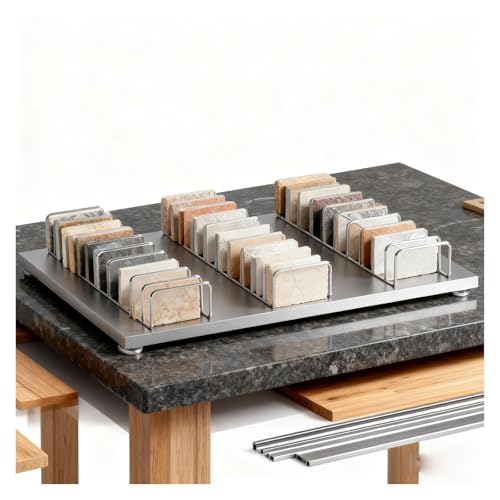 商業用マルチスロット小型卓上タイルディスプレイラック。省スペース設計で、ショールームやイベントに最適。シルバー色、サイズはL-50CM (19.7IN)。