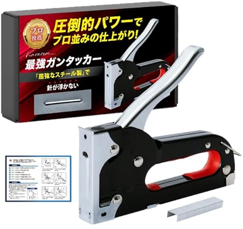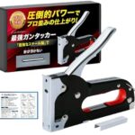 Kuracoru タッカーは、重量380gで打ち込みが強力なガンタッカーです。替針200本が付属しており、様々な作業に対応できます。