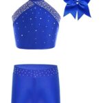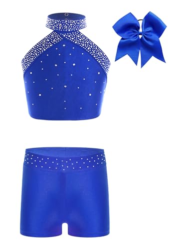 Vxuxlje 子供用女の子向けフィギュアスケート、体操、ダンス用コスチューム。光沢のあるデザインで、ラインストーン入りのクロップトップとショーツ、ヘッドウェアセット、トラックスーツ付き。