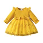 Kuhvvseの子供服、女の子用ドレスは、薄手でかわいいチュールワンピース。長袖と半袖があり、結婚式や入園式、卒園式にぴったり。サイズは80〜130、春夏秋冬に適したデザイン。80サイズはイエロー。
