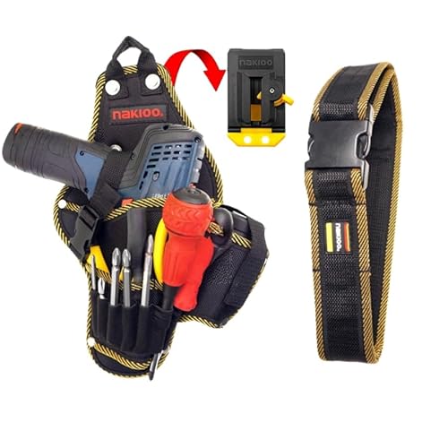 この電動ドリル用ツールホルダーは、バネ式開閉の3段構造で、工具落下防止機能付き。防水オックスフォード布を使用し、ドライバーホルダーや着脱式ツールが特徴。電気工事、大工、DIY、釣りに対応する作業用ツールベルトです。