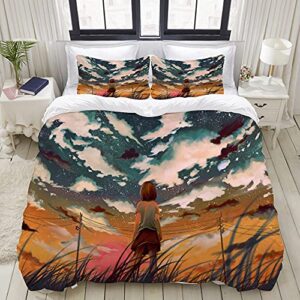 DAOLOWE 布団カバー 4点セット セミダブル 日本のアニメ漫画スカイサンセット 洋式・和式兼用 掛け布団カバー ボックスシーツ 枕カバー 洗える 寝具カバーセット(175x210CM)