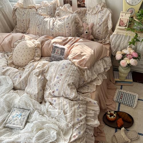 この寝具カバー4点セットは、花柄デザインでシングル・ダブル兼用。掛け布団カバー(150x200cm)、ベッドシーツ(180x230cm)、枕カバー(48x74cm×2)のセットです。綿100%で肌触りが優しく、オールシーズン使用可能。洗濯もでき、フリル付きで柔らかな感触が魅力です。