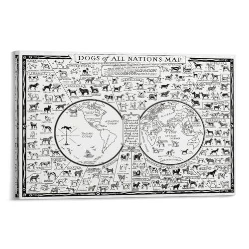 すべての国の犬の地図プリント。モダンな世界の犬の地図ポスターで、キャンバス素材。おしゃれな壁アートとして、家庭の装飾に最適。ギフトにもおすすめです。