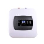 JICOMUSの小型電気温水器は15L/20L/30Lの容量で、110V・1500W仕様。調節可能で、家庭用キッチンや洗面台に簡単設置できます。上部コンセントの20Lモデルです。