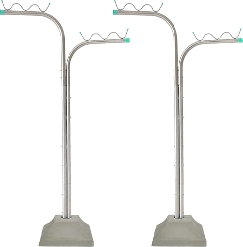 屋外風に強いオールステンレス製の組み立て式物干し台。段違い一体型で、安定性を高めるコンクリートベース1穴付き。錆びにくく耐久性があり、長期間使用可能です。