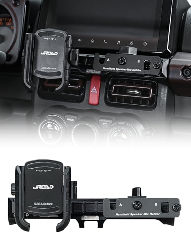 スズキ ジムニーシエラ専用の車載ホルダー。JC74/JB64/JB74対応、多機能ブラケット付き。安定性抜群のアルミ合金製、片手操作で調節可能。トランシーバーやスマホの脱落防止機能付き。