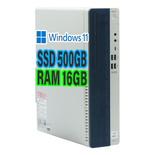 NEC Mate MBシリーズの整備済デスクトップ。Windows 11、Core i3 10100、メモリ16GB、SSD500GB搭載で高速起動。Display PortやHDMIでマルチ画面対応。Ms Office 2019も付属。