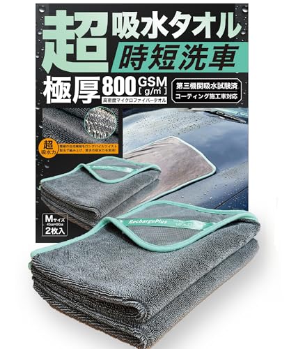 RechargePlusのプロ推薦洗車タオルは、大判マイクロファイバー製の超吸水クロスです。新Mサイズの2枚セットで、効率的な洗車と拭き取りが可能です。耐久性もあり、車のボディを傷めずにしっかりサポートします。