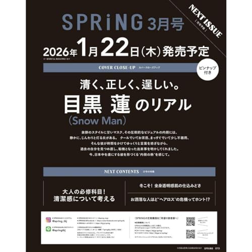 SPRiNG 2026年3月号の表紙は目黒蓮が飾る特別号です。ファッション特集やインタビューが豊富で、春のトレンドが詰まっています。目黒の魅力がたっぷり詰まった一冊です。
