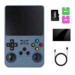 R36sポータブルゲーム機は3.5インチHDディスプレイ、64G/128Gストレージ、20000ゲーム収録。1.5Ghzの64ビットチップ搭載、3500mAhバッテリーで外部コントローラーを接続し2人対戦可能(灰色)。