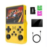 ポータブルゲーム機 R36sは、3.5インチHD画面、64G/128Gストレージ、20000ゲーム収録。1.5GHz 64ビットチップ、3500mAhバッテリー、外部コントローラーで2人対戦可能。