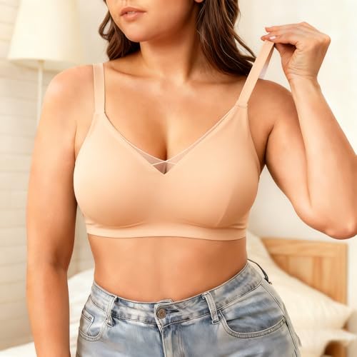 女性用プラスサイズブラ、ゼリーストリップサポートのフルカバーで、Uバックデザイン。快適なワイヤレスブラ。カラーはスキン、サイズはX-Large。