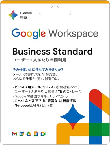 Google Workspace Business Standardは、ビジネス向けに設計されたツール群で、カスタムメール、Google Meet、ストレージ、ドキュメント共有などの機能を提供します。コラボレーションを強化するための様々なサービスが利用可能です。