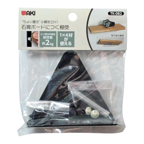 和気産業の石膏ボード用棚受け。黒いトライアングル型で、高さ19.8mm、幅85mm、奥行き70mm。強力な支持力を持つ設計で、壁面収納に最適。