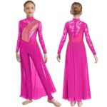 Miaeowveのガールズ体操&フィギュアスケート用ロンパースは、ホットピンクのタンク型デザインで、フローラルレース付き。15-16歳向けで、パフォーマンスに最適なスタイルです。