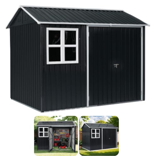 屋外用のスチール製物置で、容量8888Lの大型収納庫です。両開きドア、施錠対応、窓付き、換気口付きで防水設計。サイズは幅249cm、奥行き184cm、高194cm。人字型屋根で雨に強く、おしゃれなデザインが魅力。ガーデニングや庭の収納に最適。