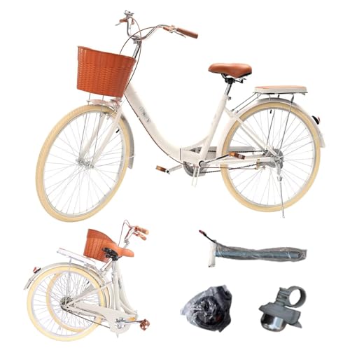 折りたたみ自転車 レディース用、軽量で26インチ大型カゴ付き。高炭素鋼フレーム、調節可能なハンドル・サドル。通勤や学生に最適。ライトブルーとライトイエローのカラーバリエーションあり。泥除け付きでおしゃれなデザイン。