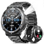 軍用規格のスマートウォッチ。Bluetooth通話、GPS連動、100+運動モード、3ATM防水。400mAhバッテリー、カメラ/音楽制御、音声アシスタント。歩数計、目覚まし時計、天気予報対応。iPhone/Android対応、1.53インチ大画面。